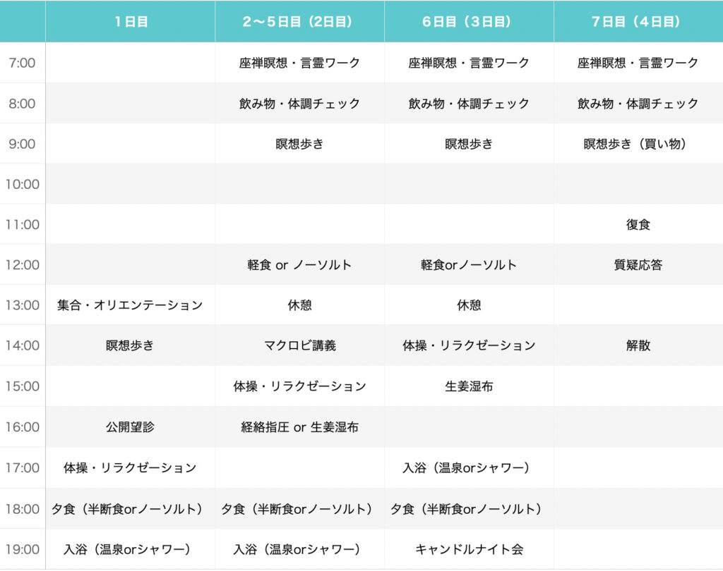 塩抜きノーソルトが効果を表すのは、塩分が2〜3日ほど入ってこなくなったタイミング、つまり断食3〜4日目頃から。そのため6泊7日が必要なのです。